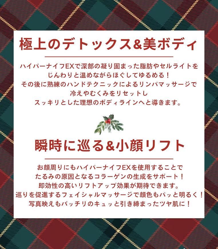 そこで今回は、ホリデーシーズンにふさわしい、気分が上がるだけでなく効果にも徹底的にこだわった【クリスマス前準備 特別セットコース】をご紹介します!