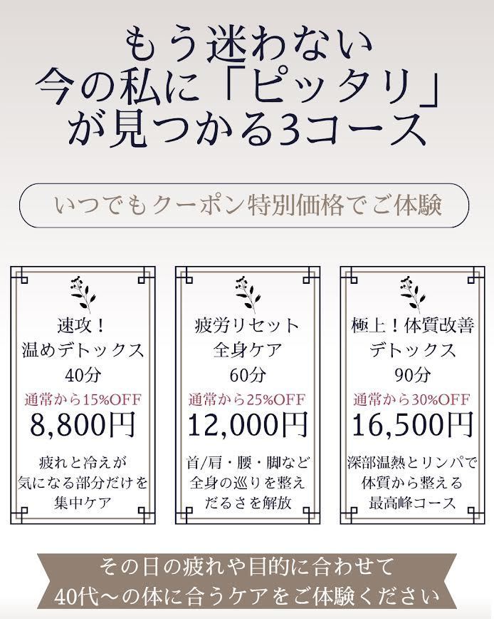 まずは、いつでもクーポン価格の選べる3つの施術で、この心地よさと確かな変化をご体験ください。